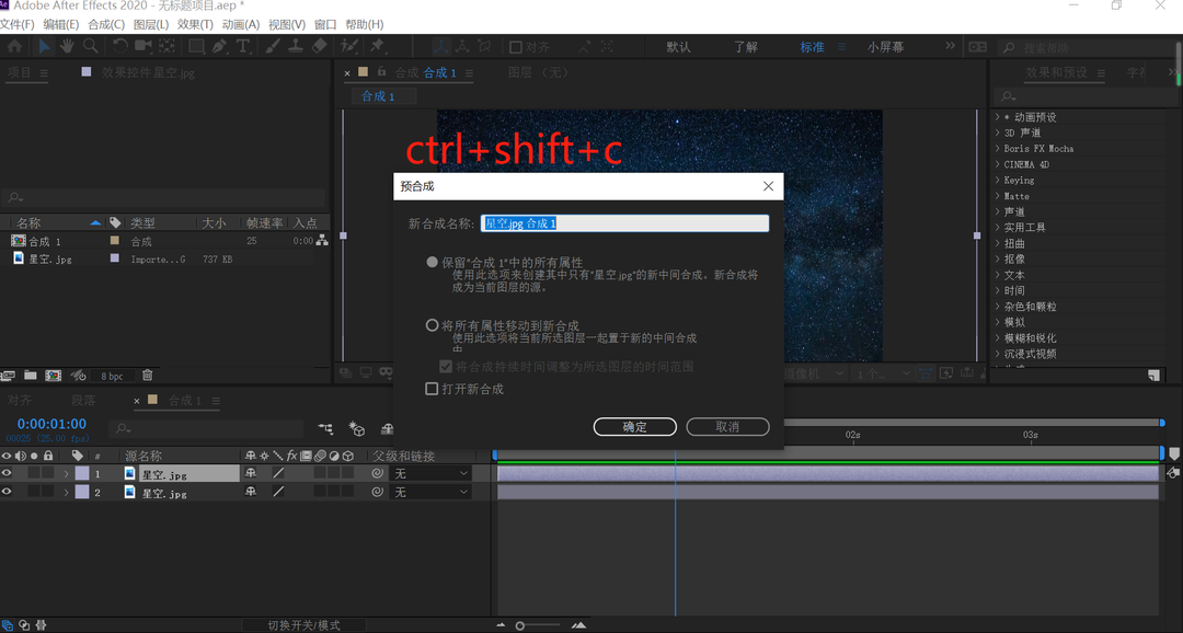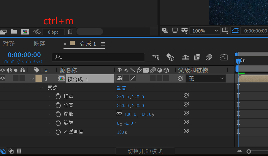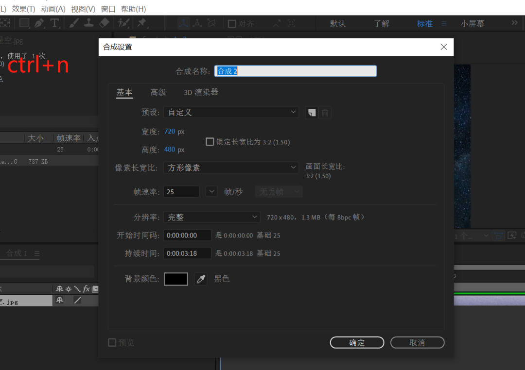 1.ctrl+n:新建一个合成窗口,一般设置大小帧速率和时间长度