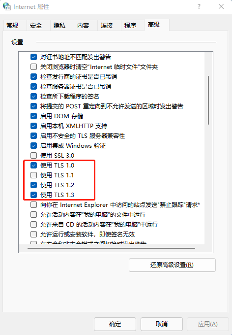 进入操作系统控制面板-网络共享中心-internet选项-高级-将TLS 1.0,TLS 1.1,TLS 1.2全部勾选即可。