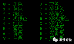 1、输入’color 字符’,即可改变字体颜色,这里字符选值如下: