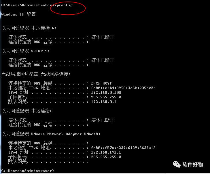 输入ipconfig即可查看当前设备的IP地址,不用再用鼠标去多次点击了。