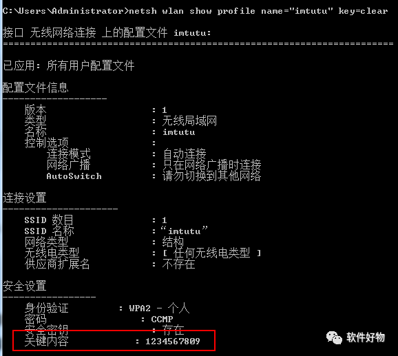 netsh wlan show profile name="你连过的WiFi名" key=clear