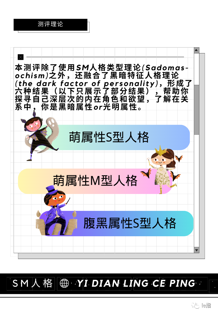 ※本测评除了使用SM人格类型理论(Sadomas·ochism)之外,还融合了黑暗特征人格理论(the dark factor of personality),形成了六种结果(以下只展示了部分结果),帮助你探寻自己深层次的内在角色和欲望,了解在关系中,你属于黑暗属性or光明属性。