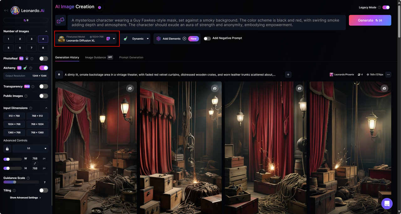 生成提示词之后我们直接去Leonardo AI中生成图片,短视频的话选择9:16,中长视频就是16:9