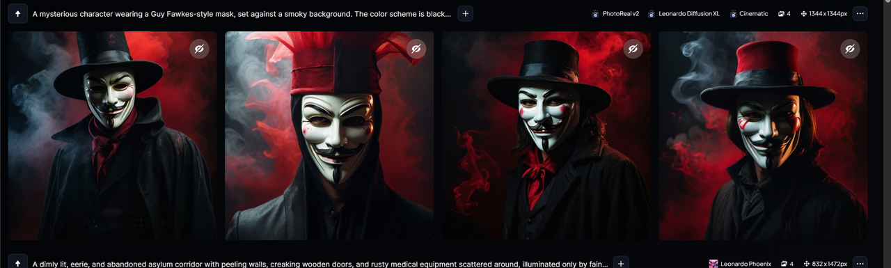 我选第X个。我有几个小要求:主题色调就是黑色和红色,我想要这LOGO上画个神秘人物,最好戴个像盖·福克斯(Guy Fawkes)那样的面具。另外,背景里加点烟雾效果,这样更有氛围。现在你给我5个文本提示Prompt,我好在Leonardo AI里用,尽量帮我整点独特的东西出来哈。