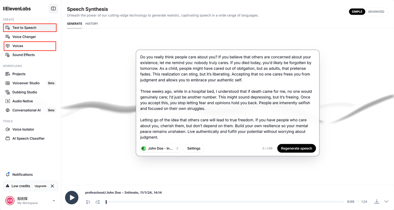 配音的话我们可以选择剪映中免费的适合你们的配音,这里我选择的是elevenlabs这个配音软件,个人感觉这个配音软件十分的好用,可以免费使用10000个字母和字体,这次本来想展示中长视频的,谁知道额度不够了嘿嘿,该充钱了,那就展示一下短视频吧。