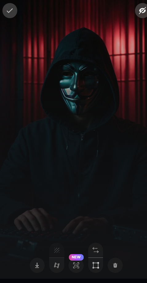 帮我生成3个文本提示prompt,我想在Leonardo AI这样的AI图片工具里用。我想要一个神秘角色的图片,得穿黑色衣服,不露脸,戴个那种匿名的盖·福克斯面具。主题色调就是黑色和红色,背景要暗点,感觉像YouTuber那种房间就行。