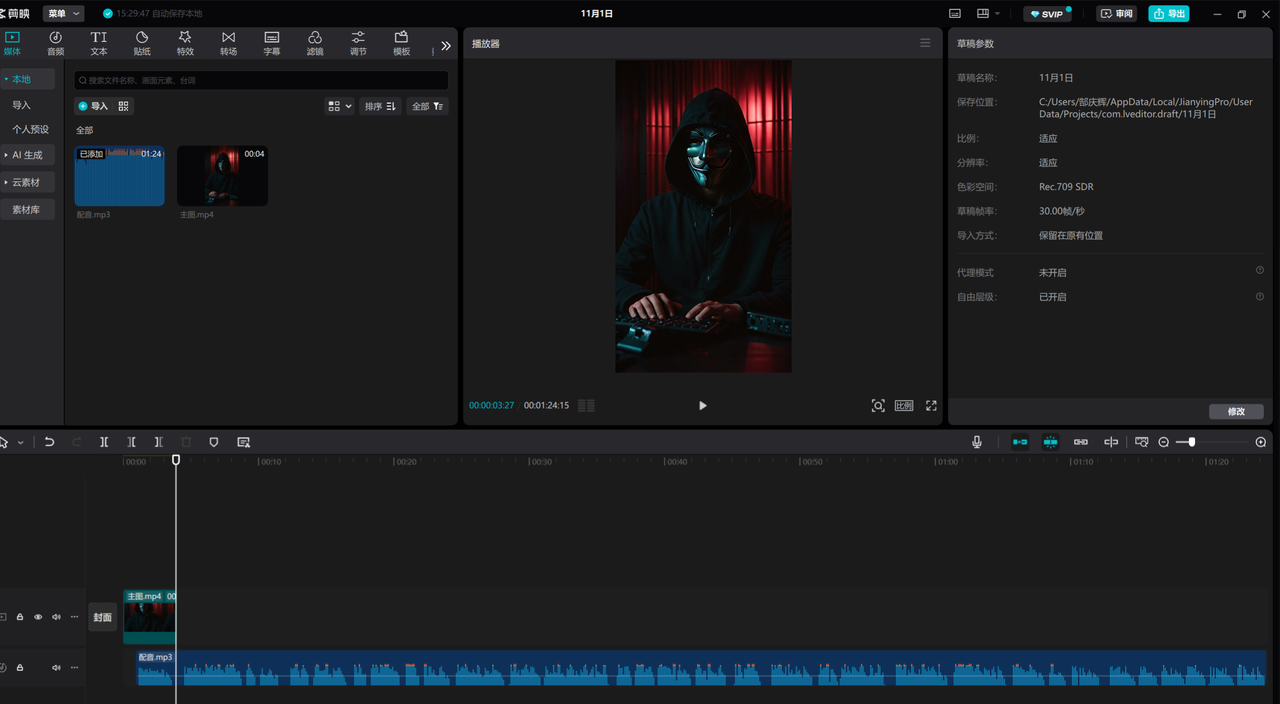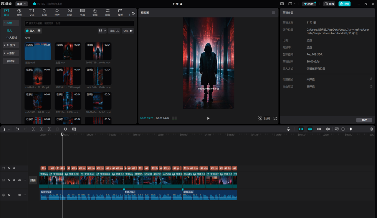 可以将我们生成的视频,和下载的配音都暂时放入剪映中,还是需要用到剪映的。