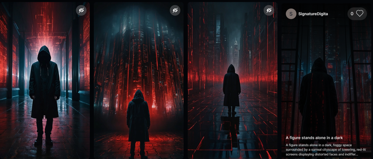 你来帮我做我视频里的图像提示prompt。我会把剧本一段段地发给你,你就给每段找个能吸引人的画面,需要生成出4个完全不同的故事情节画面prompt,第二个promt需要与第一个promt相关联,第二个prompt要与第二个prompt相关联,第4个prompt要与第三个prompt相关联,所有的prompt所表达出来的故事情节都不要重复了。记得啊,这些画面得跟故事情节搭,还得有那种神秘、高科技的矩阵风格。我发的每一段,希望你能用文字详细的描述出超好看的视觉画面哦!主色调为黑色和红色。