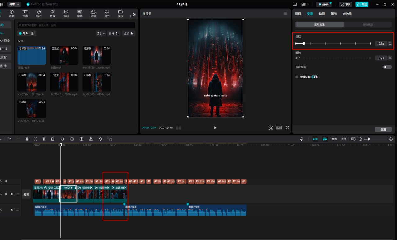 现在把图生的视频放在剪映中,如果视频和音频对不上,放慢视频的速度