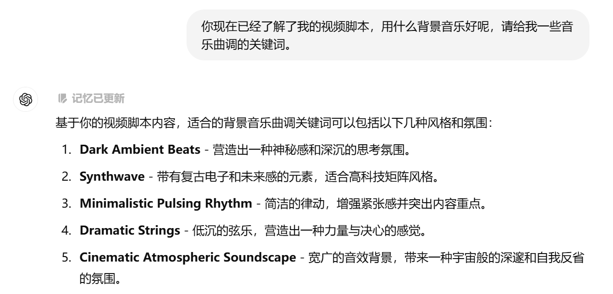 可以让GPT生成背景音乐提示词,然后直接去剪映搜索对应的免费音乐。