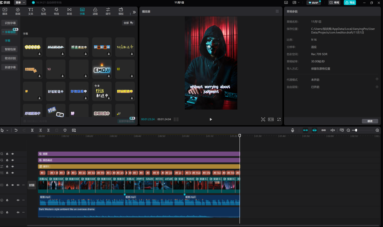 7.配置背景音乐、特效、转场、字幕加效果