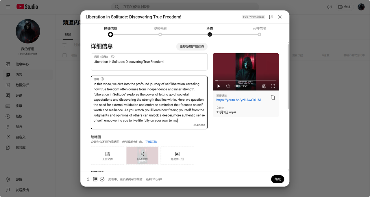 在上面生成的名字中选择一下,让GPT帮你生成频道简介。