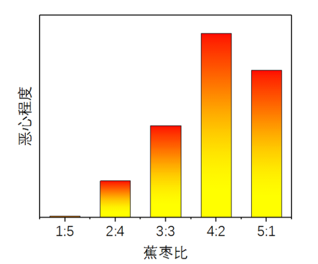这种现象很可能说明,香蕉和枣对恶心味道的产生起着不同的作用。需要先形成一个以香蕉为主的环境,然后枣中的化学物质再在这个环境中发生化学反应,进而产生恶心的味道。这本质上就是化工当中的反应动力学问题。