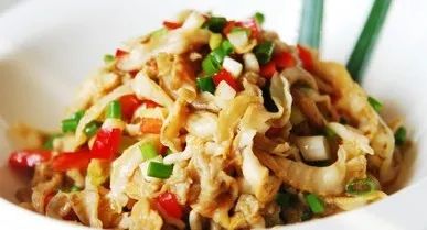 扇贝拿去做蒜蓉粉丝扇贝或烧烤了,扇贝边也别浪费,和胡萝卜丝、黄瓜丝、青椒丝一起温拌,就是烧烤店里一道酸酸辣辣的凉菜。