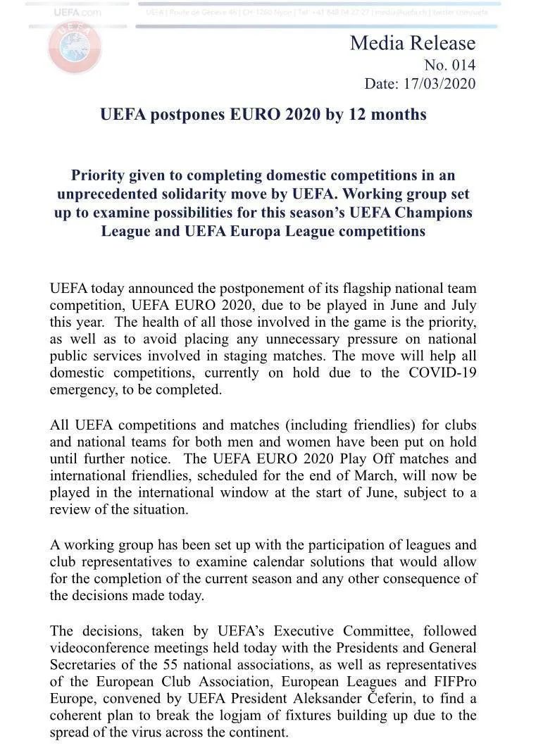 根据BBC记者西蒙·斯通推特爆料称,欧足联原本希望保密欧洲杯延期决定,但挪威足协却率先官宣此事。随后欧足联官网正式发文,宣布2020欧洲杯将延期12个月举行。