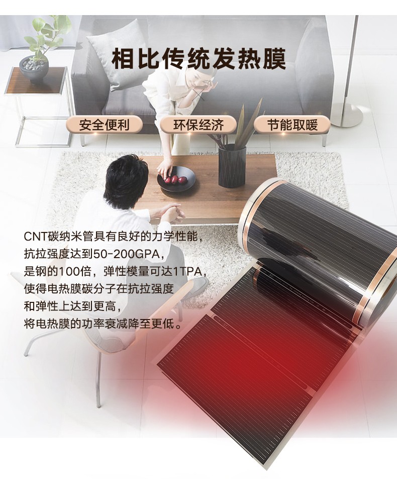 02 石墨烯电热膜工作时的表面温度是多少?当石墨烯电热膜通电时,温度升高。根据环境,薄膜表面达到约5-10分钟的校准温度:18-35℃。在长期不间断运行的条件下,电热膜的表面温度不超过50℃,因此石墨烯电热膜产品是一种非常安全的加热产品。