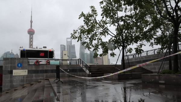 上海外滩江堤区域已拉起警戒线并临时关闭。黄浦江水位的确比平日高,但始终可控。