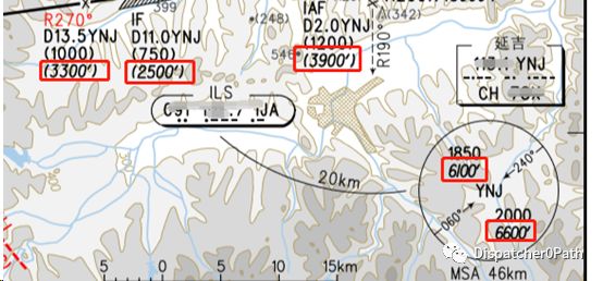 再看下一张,延吉机场是军民合用机场,该传统进近图中的高度,在标识中就使用仅带()标志的高度,以表明这些高度是场压作为基准的高度,需要航空器在执行进近时使用场压作为基准。