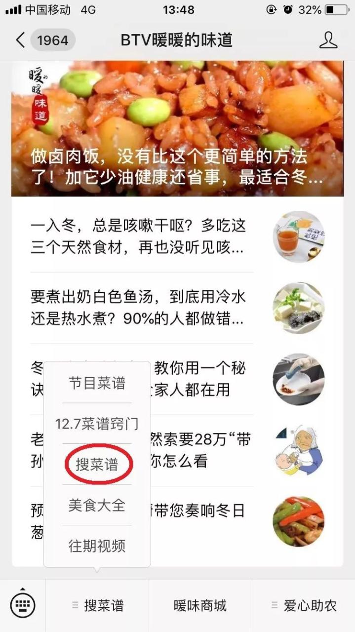 ①、周末的节目菜谱,周一周二3条都会有详细的图文+视频菜谱。②、或者,可按照下图路径:底部菜单中【搜菜谱】→输入菜谱名字,例如“卤肉饭”→即可获取完整菜谱。