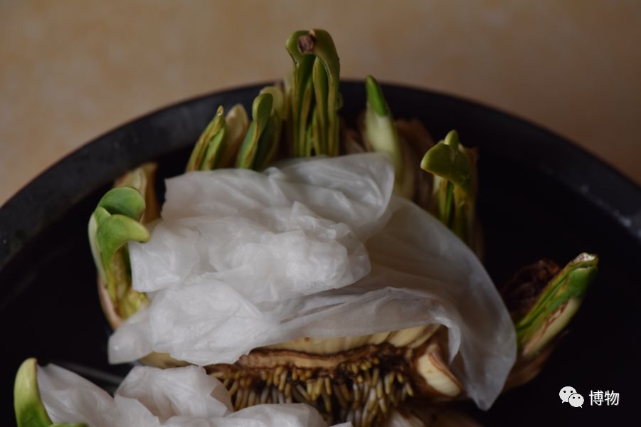 第六步:刻完后,水仙会流出很多黏液,把它们冲掉,在伤口处盖满湿的棉花或卫生纸,伤口朝上放在水仙盆里,加水,在避光处泡3天,每天换一次水和覆盖物。