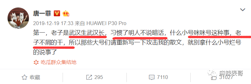 比如唐一菲不是说了么?说“老子是武汉生武汉长,习惯了明人不说暗话,什么小号咪咪号这种事,老子不屑的干”