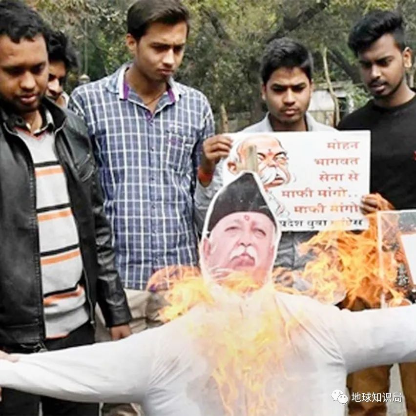 RSS现任主席莫汉·巴格瓦的人形立牌被焚烧