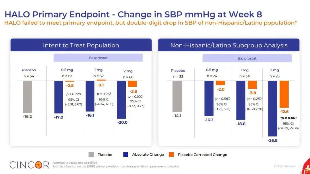 很不幸,Baxdrostat在HALO研究中失利了。2022年11月披露的资料显示,尽管收缩压绝对值大幅降低,该药却未达到意向治疗人群的主要终点。CinCor股价应声下跌近50%。随后,阿斯利康借势下压了谈判价格,总金额最高为18亿美元,并取决于Baxdrostat能否获得监管批准。