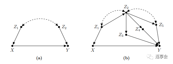图 a 给出了一个简单的有关处理变量 (treatment variable) 和结果变量 (outcome variable) 的经济模型,并且两个变量之间的关系被箭头连接,用来表明两个因素之间的因果关系。此外, 和 是两个可能会影响处理变量和结果变量的混杂因素,是相互关联的 (correlated),并通过图中的虚线双向弧线来表示。同时, 和 这种相互关联的关系,也给处理变量和结果变量之间的关系提供了一个活动途径 (Pearl,2000)。因此, 和 不仅通过真正的因果路径 连接,而且还通过第二条路径 ( 对 的因果关系)、 ( 对 的因果关系)、以及 ( 和 有相互关联的作用) 来连接,这会产生虚假的非因果关系。
