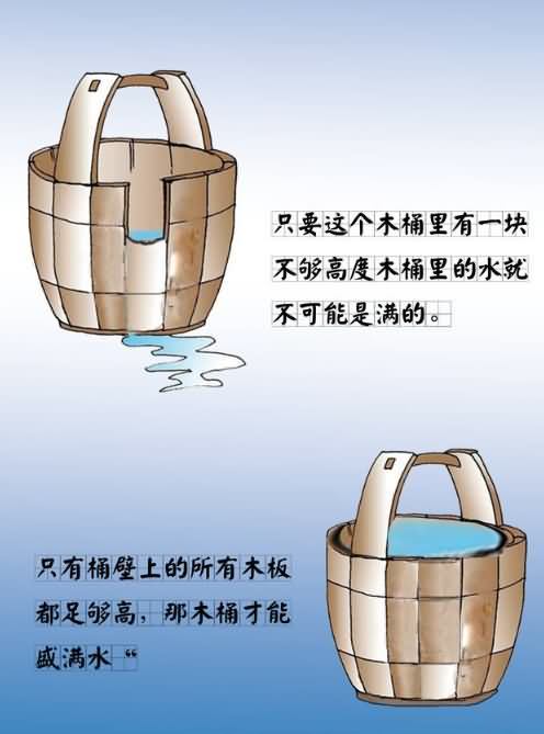 水桶原理是由美国管理学家彼得提出的。说的是由多块木板构成的水桶,其价值在于其盛水量的多少,但决定水桶盛水量多少的关键因素不是其最长的板块,而是其最短的板块。