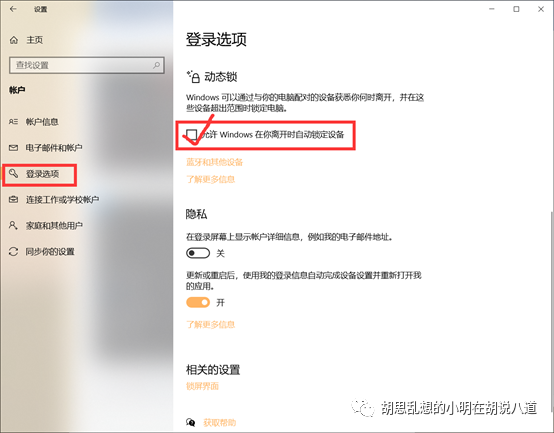第二步:“设置”→“账户”→“登录选项”→勾选“允许Windows在你离开时自动锁定设备”即可。