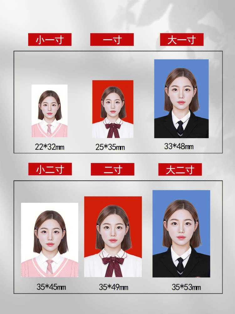 1寸照片尺寸是2.5cm*3.5cm;295*413像素;如:保险、医保、IC卡、暂住证、结婚照。