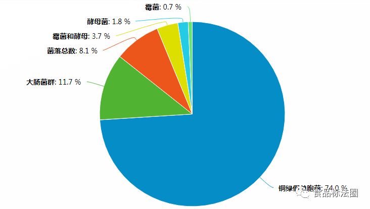 根据食品伙伴网食品抽检信息查询分析系统整理的国家及省级食品监管部门自2015年-2018年间关于包装饮用水的抽检数据,共检出5158批次不合格的包装饮用水,主要涉及微生物、质量指标、污染物限量、标签标示等方面,如图1所示,微生物为主要不合格原因,占比高达69.1%(3610批次)。对微生物不合格项目进行统计分析,如图2所示,铜绿假单胞菌不合格率占比74.0%(2819批次)。成为包装饮用水最突出的质量安全问题。