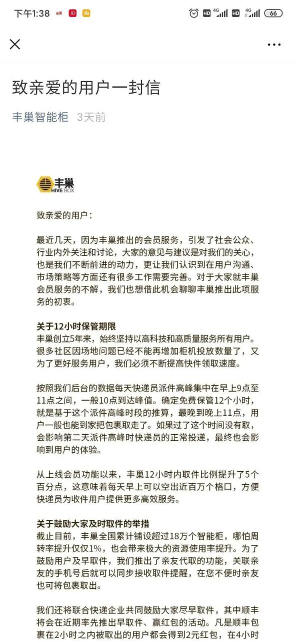 其次危机公关,当晚,丰巢也发布了一封给用户的信。深表不安的同时,解释初衷并推出鼓励尽早取件的红包政策。认为其推出的“会员服务”是对行业服务能力提升的通盘考量,错就错在未能向公众“解释清楚”。