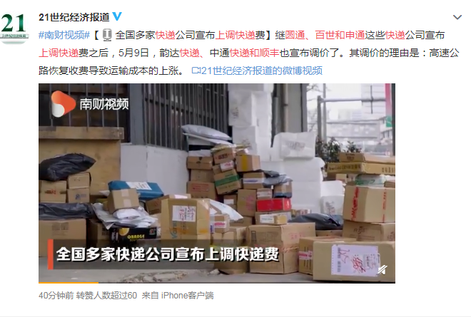 这边烽火未平,另一边硝烟乍起。从5月6日到9日,百世、申通、顺丰和圆通先后宣布将上调快递费,引发行业端连锁反应,进一步放大了舆论的反噬效应。