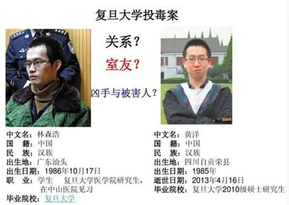 2013年4月,复旦大学上海医学院研究生黄洋遭他人投毒后死亡。凶手林森浩是受害人黄洋的室友,投毒药品为一种剧毒化学品。同类案件较多,一时成为网上热点,纷纷“谢室友不杀之恩”。