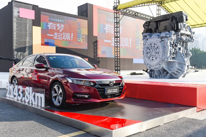在现场,广汽本田摆出了雅阁巨大的i-MMD混动发动机的模型,并且在一台雅阁旁边标注了2143.8km的数字。