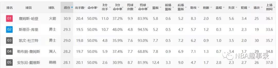 第四本来是詹姆斯,去掉罚球之后变成了凯文杜兰特,杜兰特本赛季场均拿到29分,去掉7.1次罚球以后,变成了21.9分。