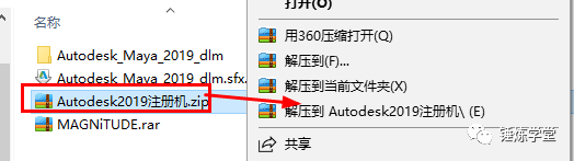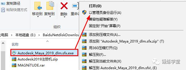 1、准备好Maya2019的安装包,右击“以管理员身份运行”,对Autodesk_Maya_2019_dlm.sfx.exe进行解压,解压到Maya2019安装包所在文件夹之下;