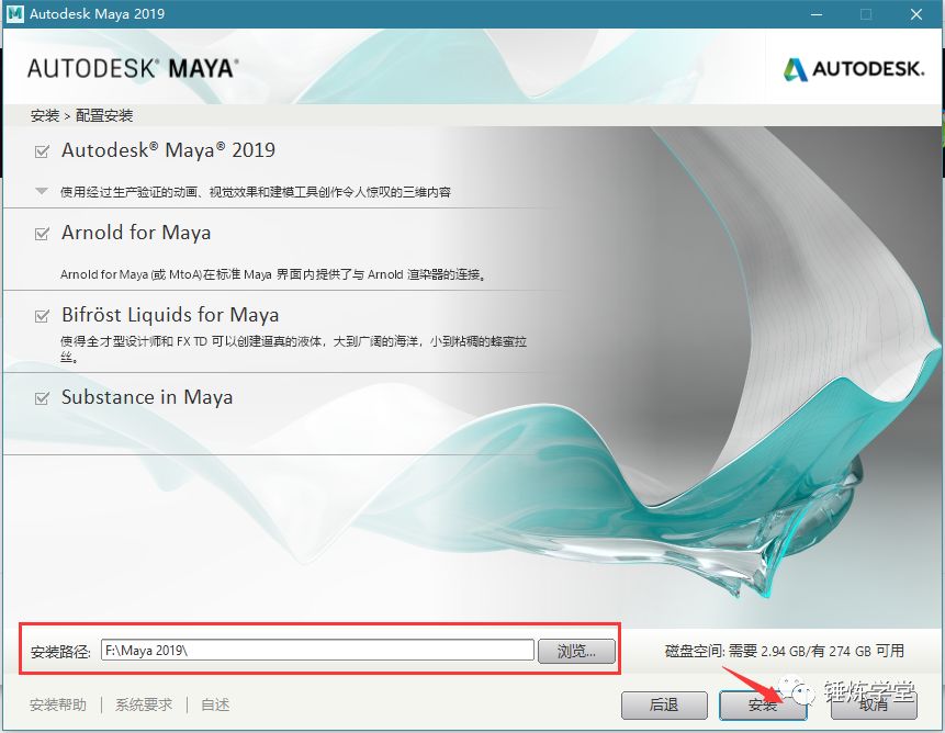 5、Maya 2019软件默认安装C盘3d动画软件,建议按照实际情况确认软件的安装位置,然后点击“安装”;