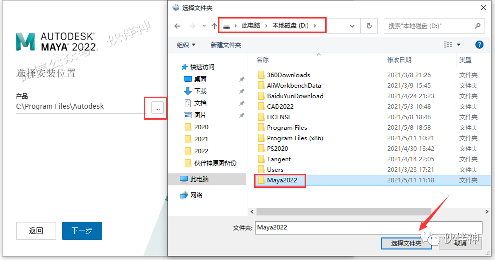 4.点击【…】选择软件安装位置(建议不要安装在C盘,可在D盘或其它磁盘下新建一个“Maya2022”文件夹)。