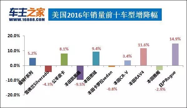 美国2016年汽车销量基本与2015年持平,不过前十中有6款车型呈现增长。其中日产Rogue增幅最大,也是这十款车型总12月同比增幅最大的。