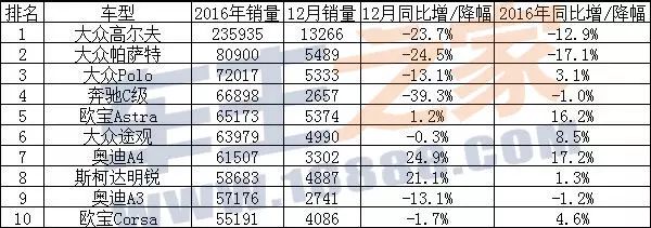 德国2016年乘用车销量335万辆,同比增4.5%。其中大众品牌销量为65.6万辆,同比下滑4.3%;其次奔驰销量31.1万辆,同比上涨8.5%;奥迪销量290万辆,同比上涨7.6%。