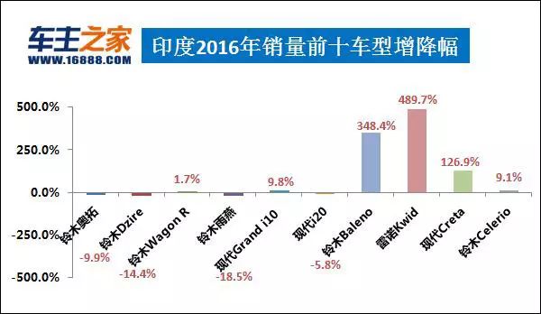 雷诺Kwid这款新车可谓异军突起,上市1年多就进入前十,要知道印度铃木可是一家独大。雷诺Kwid是十款车型中增幅最大的,而铃木几款车型大多表现不佳,除了铃木Baleno,增幅高达348.4%。