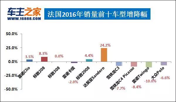 车市不景气,前十车型也呈现大幅度下滑。仅有3款车型同比增长,而雷诺Sandero更是暴跌47.7%。