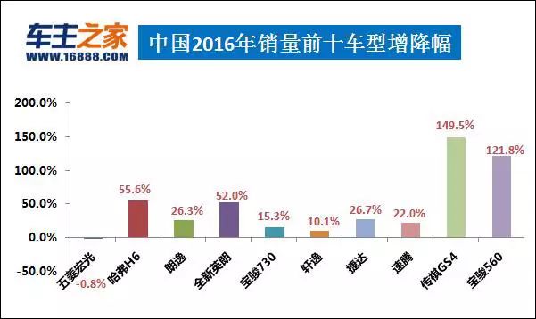 五菱宏光销量第一,同时也是这十款车型中唯一同比下滑的。自主品牌表现突出,传祺GS4、宝骏560和哈弗H6等3款自主品牌车型是增幅最大的三款车型。