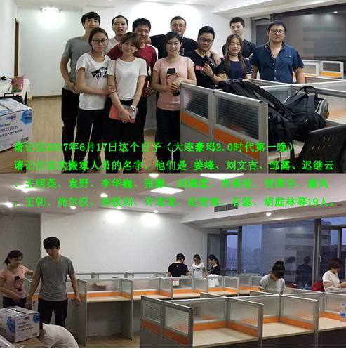 2017年6月17日,豪玛集团大连分公司由原址人寿大厦开始搬迁。在总经理姜峰的带领之下,兄弟们一起动手,开始拆隔断、拆线路、整理资料、打包电脑,先用蚂蚁搬家的方式把个人的办公用品拿到公司新址,后期找搬家公司拉了6车的货,终于把大连豪玛三年零53天积累的大部分物资搬完了。