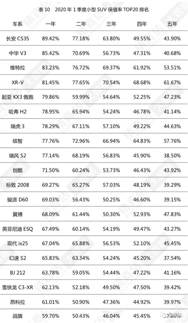 首先,来看下2020年小型SUV保值率TOP20,根据榜单显示,国产车的表现让人有点目瞪口呆,排名榜首的居然是长安CS35,它的1年保值率高达89.42%,不过它的“持续保值”并不好。铃木维特拉排名前三,而月销量破万的本田XR-V排名第四,另外哈弗H2、奇瑞瑞虎3、本田缤智、现代ix25和别克昂科拉等车型,其保值率表现也都是不错的。