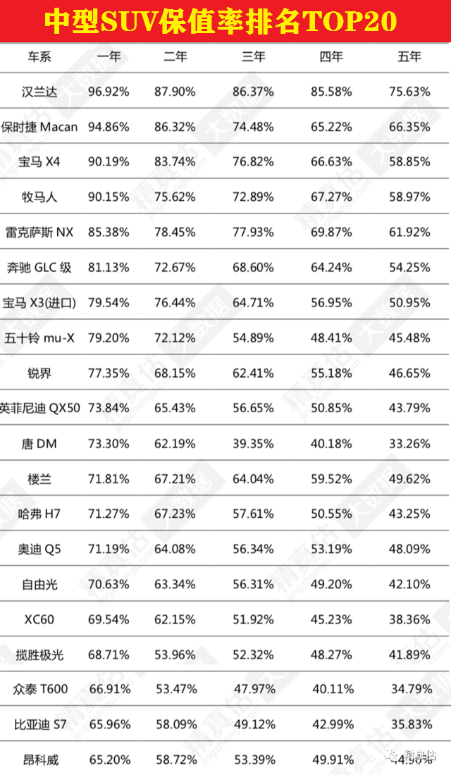再者,来看下2020年中型SUV保值率TOP20,其中比较常见的有,排名榜首的丰田汉兰达、排名第2的保时捷Macan、排名第4位的牧马人、排名第5位的雷克萨斯NX。官宣!2020年SUV保值率最新排名:80款车型上榜,你的车排名第几?另外上榜的合资SUV还有日产楼兰、奥迪Q5、Jeep自由光和别克昂科威等,而国产中型SUV也表现不错,比亚迪唐DM、哈弗H7和比亚迪S7也是非常保值。