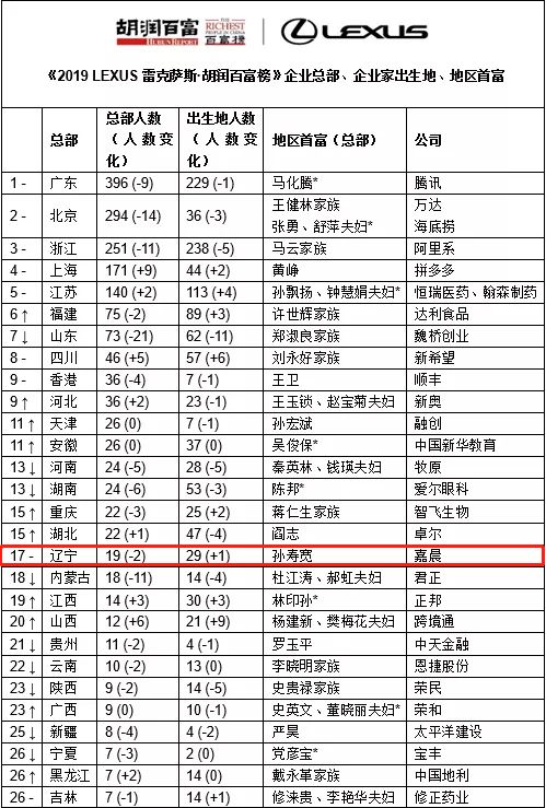 在胡润百富榜中辽宁首富,孙寿宽家族以355亿元财富,排名全国第79位,较去年上升27位,财富增加75亿,较去年增长27%,他也是今年进入前百名富豪中的唯一一位辽宁企业家。