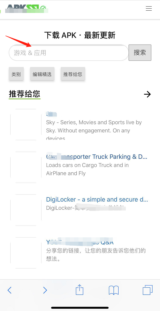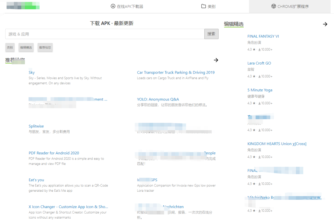 首先我们看下该网站在手机端的样子,打开后它已经适配了手机,采用竖版的排版,首页就直接是搜索框,可以搜索你需要的google国际版纯净应用。分为应用,游戏,编辑推荐等等。